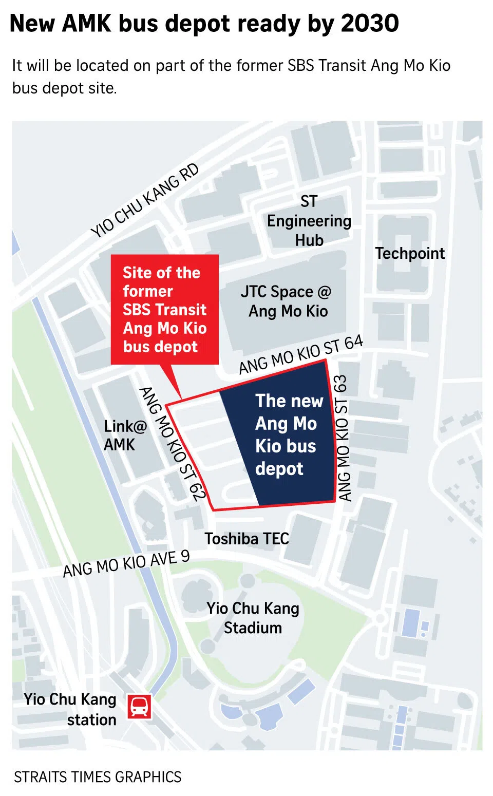 - A five-storey bus depot will be built in Ang Mo Kio Street 63 starting in 2026 and completing by 2030, with capacity for 450 buses.