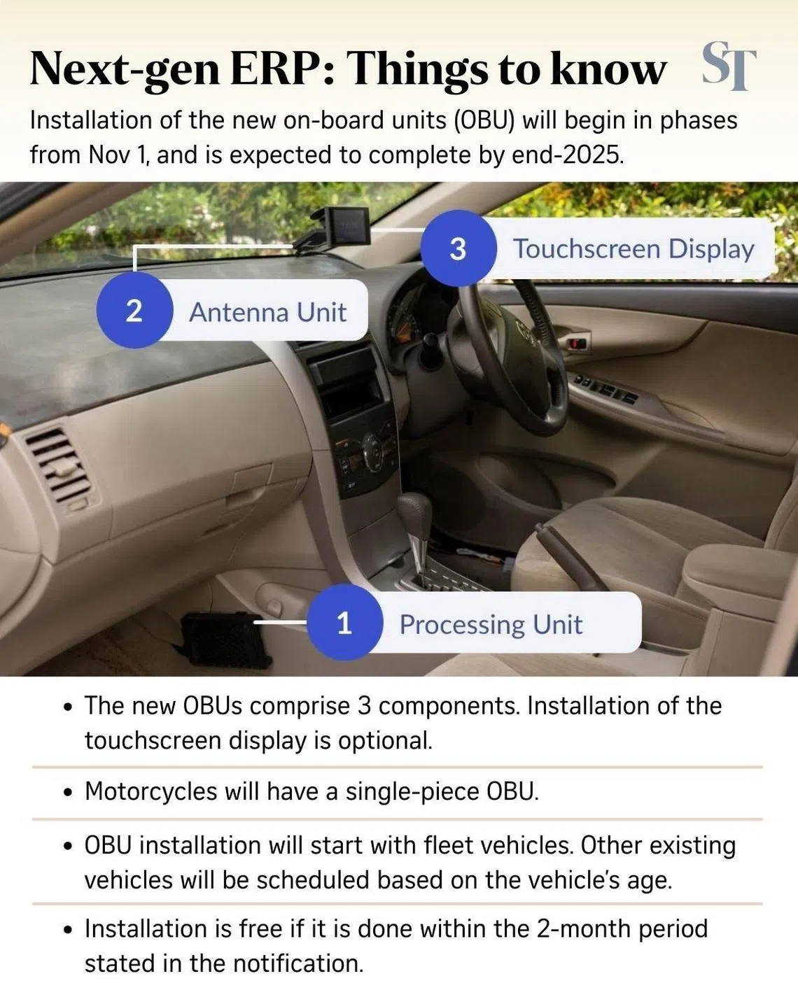 SINGAPORE – On-board units for a satellite-based Electronic Road Pricing (ERP) system will be installed in vehicles in phases from Nov 1 this year, and the exercise is expected to be concluded by the end of 2025.