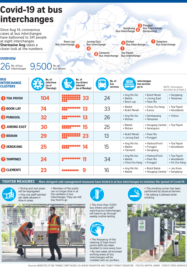 The tightened measures that cover more than 11,000 front-line staff in the bus sector were put in place in the wake of growing Covid-19 clusters at eight public bus interchanges here - Toa Payoh, Boon Lay, Punggol, Jurong East, Bishan, Sengkang, Tampines and Clementi.