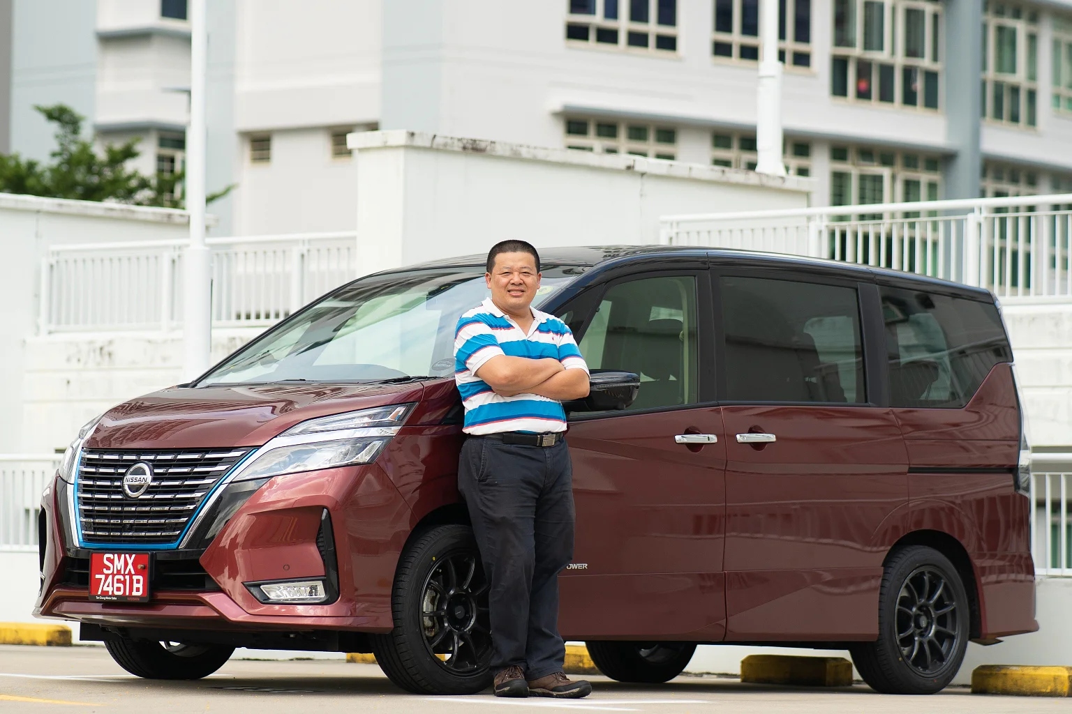 Mr Patrick Tan and his off-peak car, a Nissan Serena, which he uses frequently to go to Malaysia.