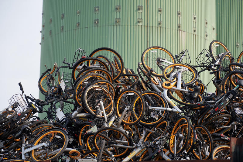 Discarded oBikes are seen at a recycling firm in Tuas on July 14, 2018.