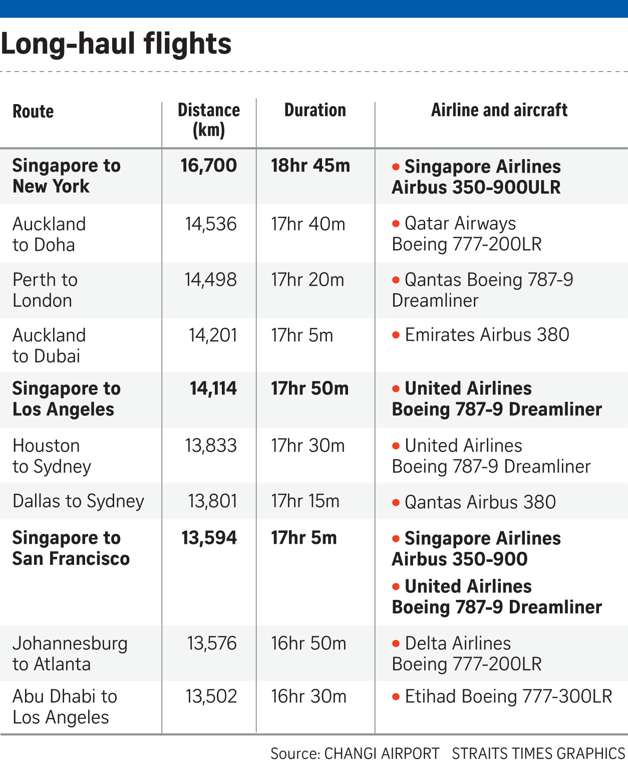 New technology has made planes more fuel efficient, prompting airlines such as SIA, Qantas and Qatar Airways to launch ultra-long-haul services. SIA's Singapore-Newark service, which uses the Airbus 350-900ULR, is currently the world's longest commercial flight, covering 16,700km.