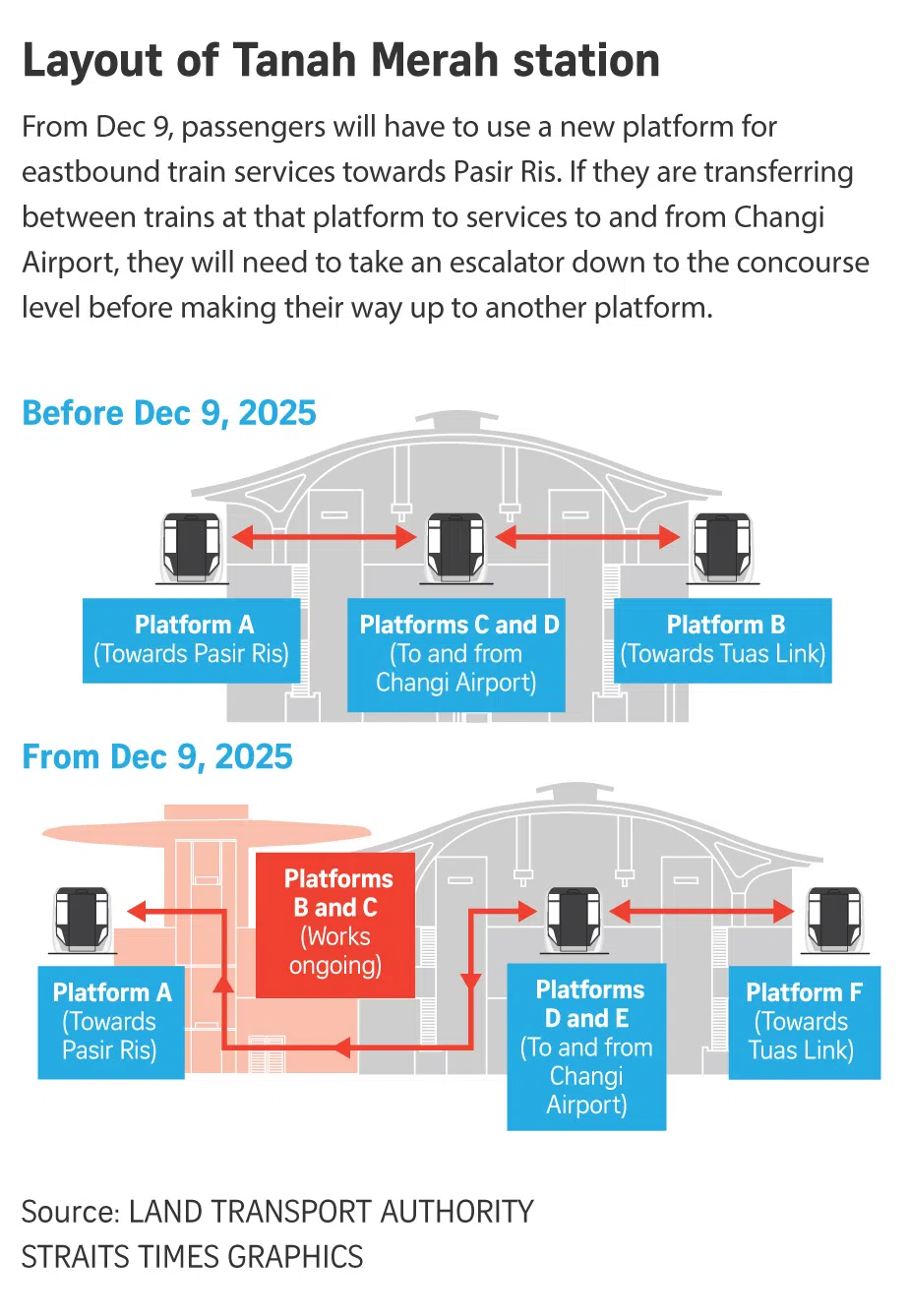From Dec 9, the eastbound EWL service towards Pasir Ris will operate from the new platform. Passengers who need to transfer between trains will then have to go down to the level of the passenger service centre before ascending to get to the other platform.