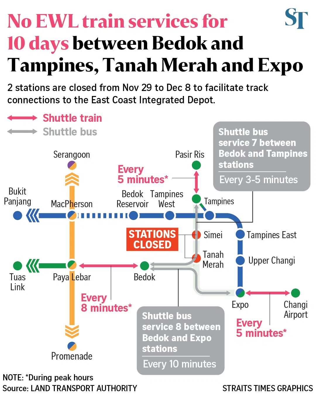 - Services between Tanah Merah-Expo and Bedok-Tampines are shut until Dec 8 for East Coast Integrated Depot connection, slated for full operation in 2026.