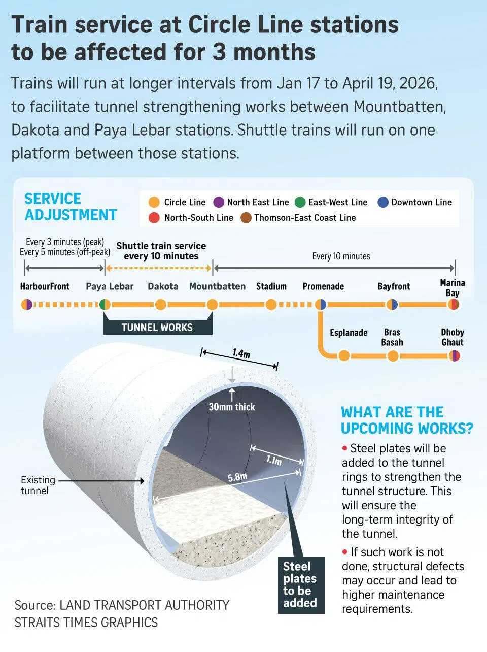 - Circle Line faces a three-month period of service adjustments (Jan 17 to April 19) for tunnel strengthening works between Mountbatten, Dakota, and Paya Lebar.