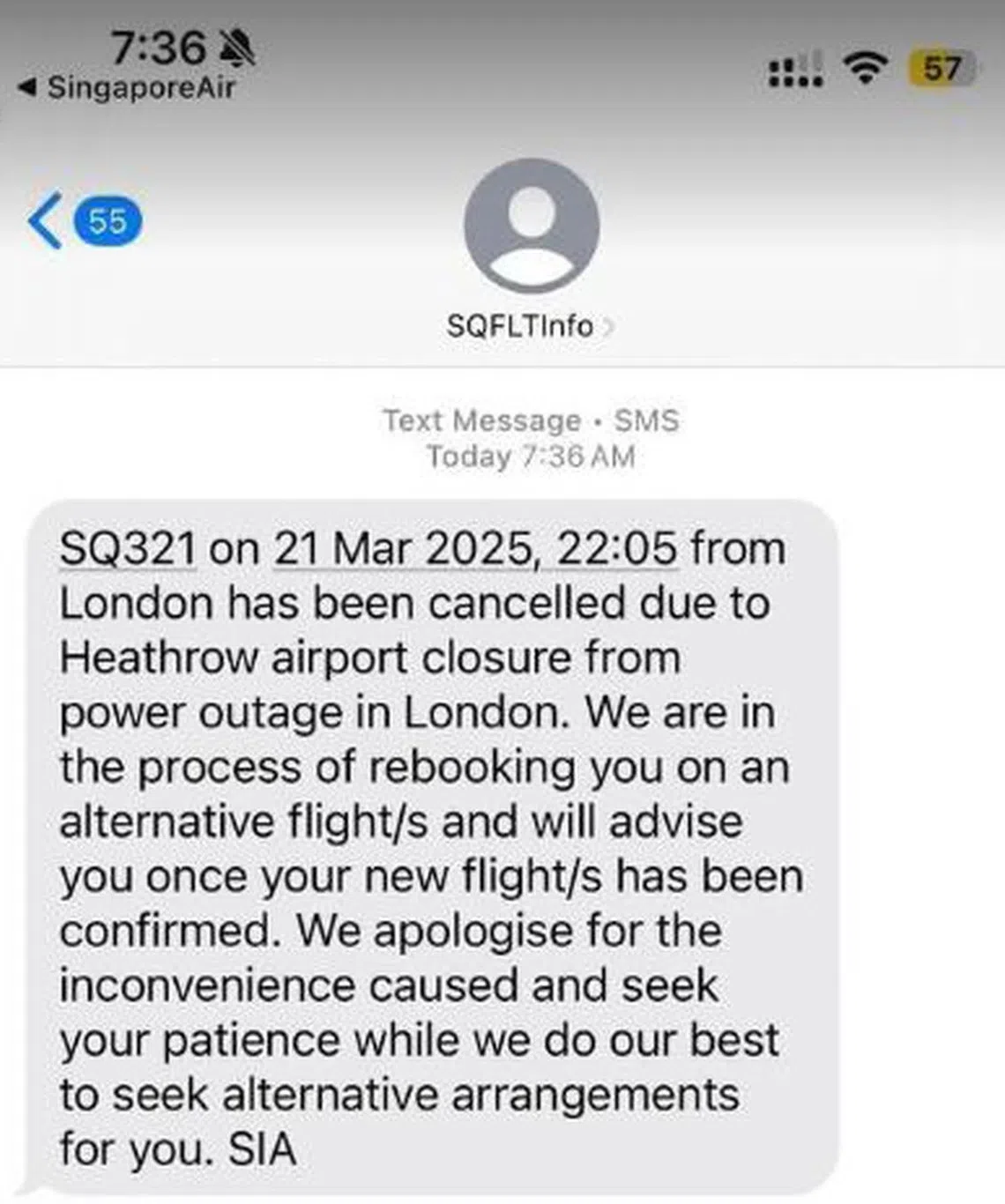 A passenger, who wanted to be known only as Ms Ashley, said she was slated to return to Singapore on SQ321 on the night of March 21, but she was informed of its cancellation at around 7.30am, London time.