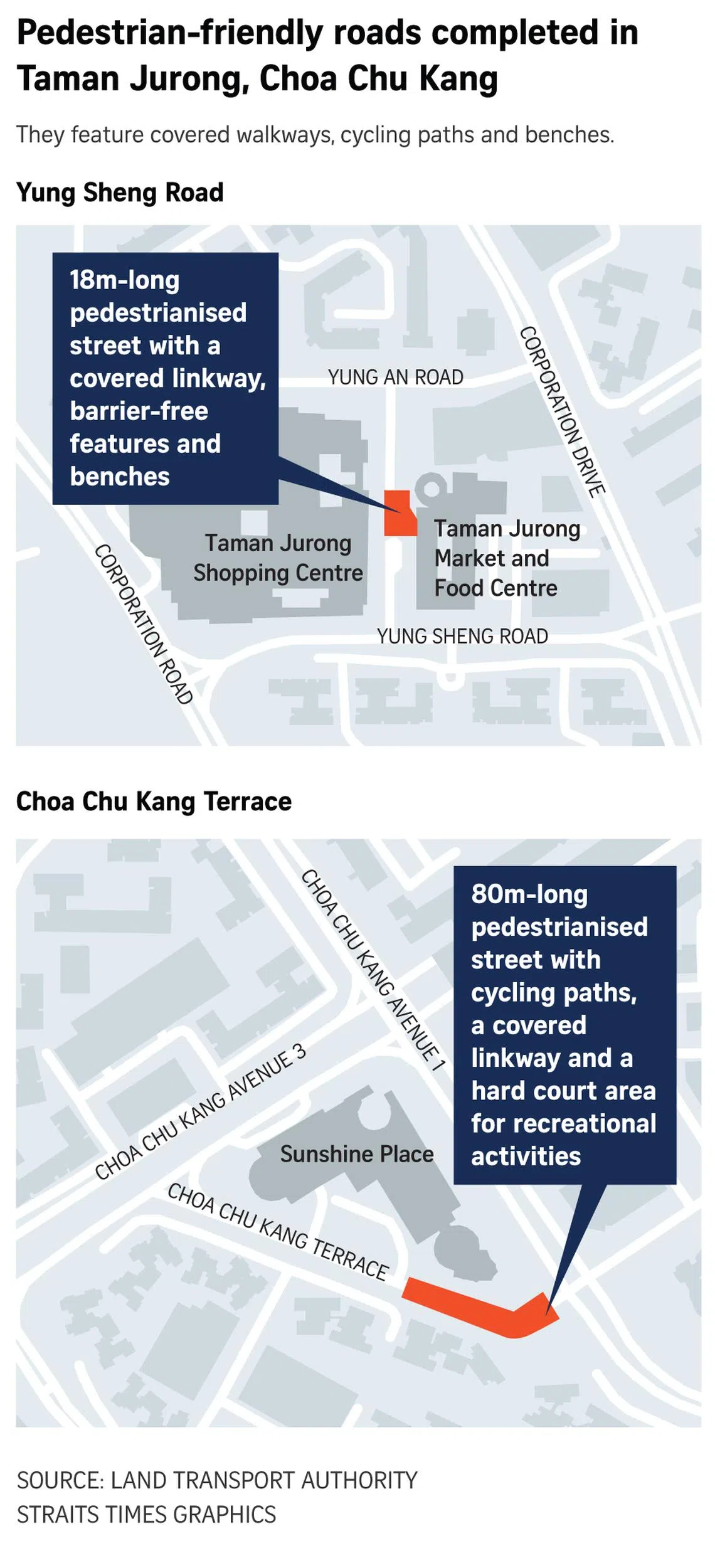 SINGAPORE – Two road-repurposing projects to create pedestrian-friendly streets in Taman Jurong and Choa Chu Kang have been completed.