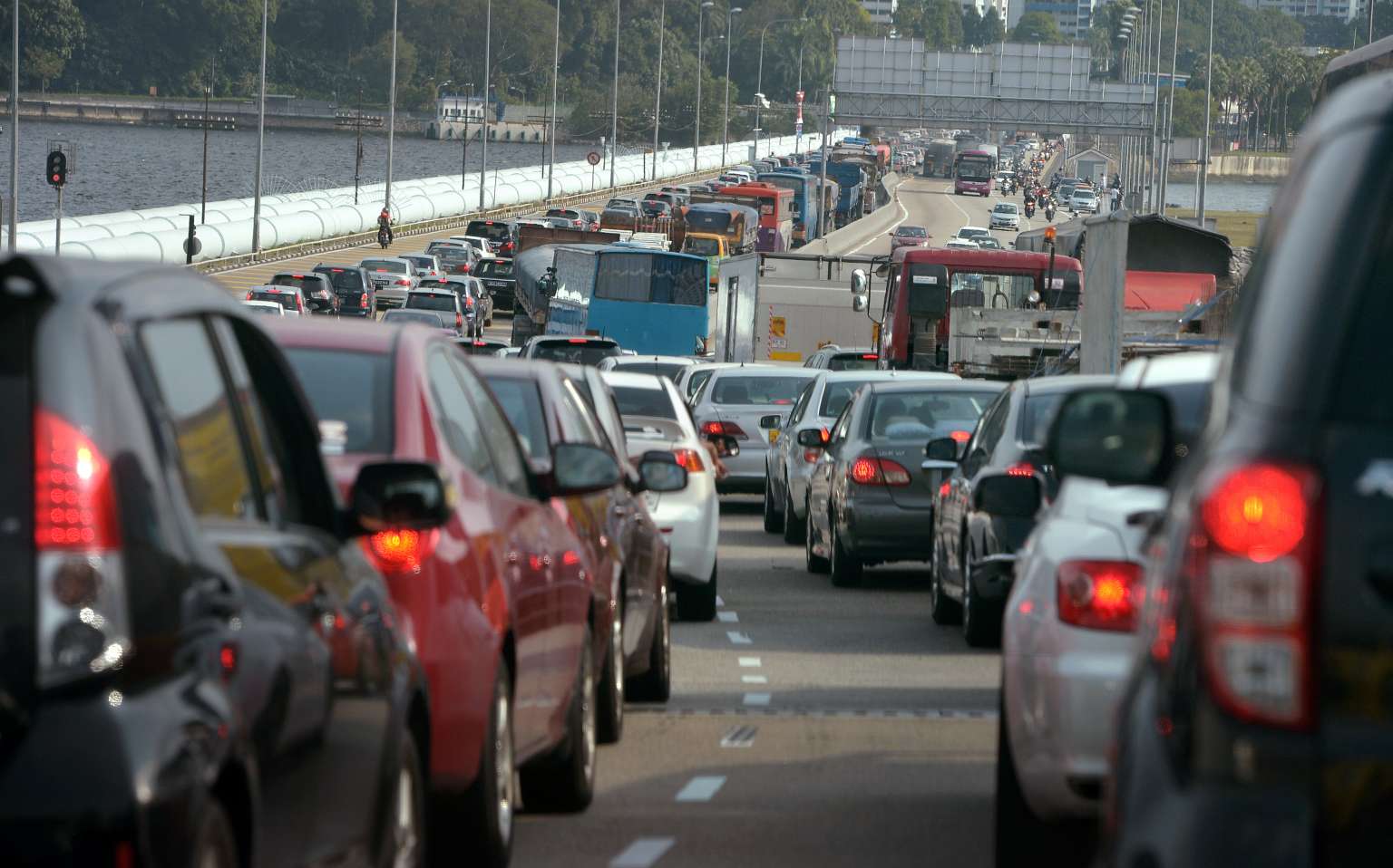 A traffic jam along the Woodlands Causeway on Jan 22, 2014, near the Woodlands Checkpoint.