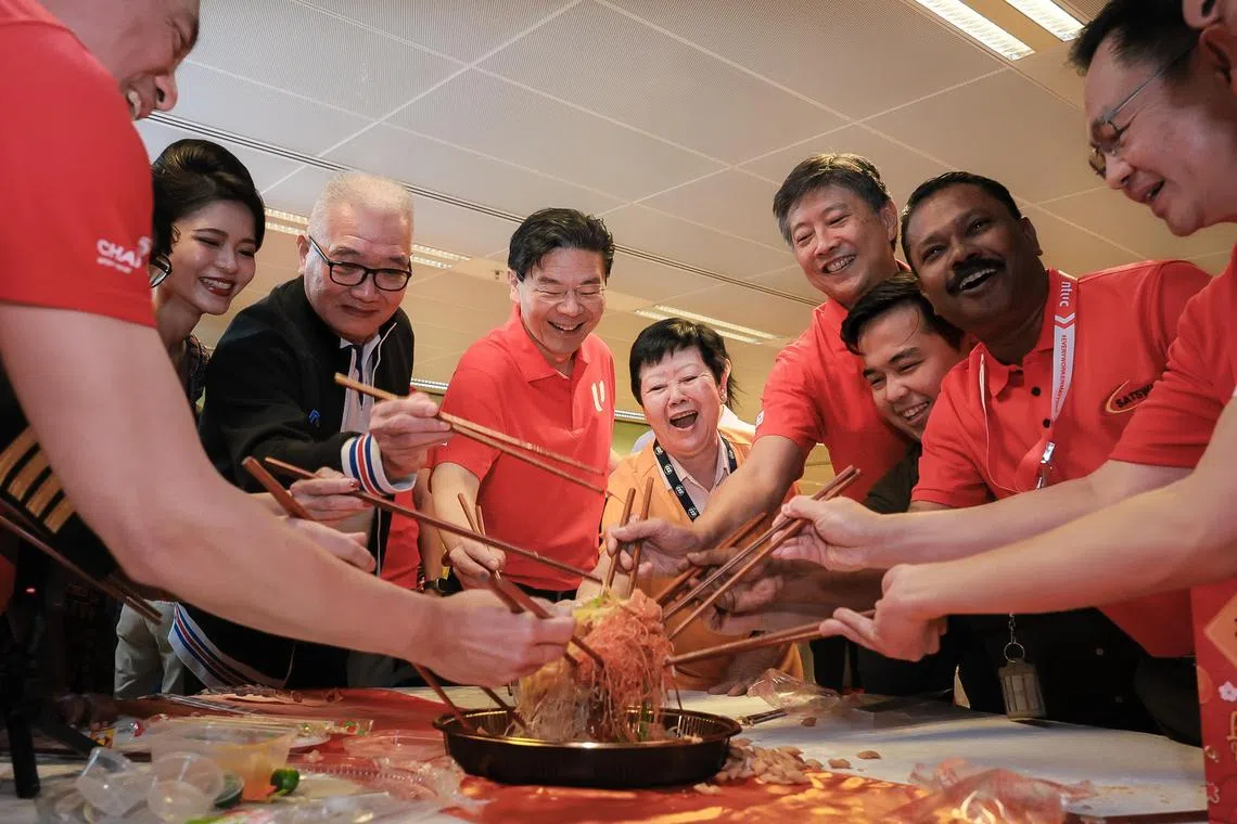 PM Lawrence Wong, together with invited guests and workers at the airport, tossing yusheng during his visit to Changi Airport on Jan 28.