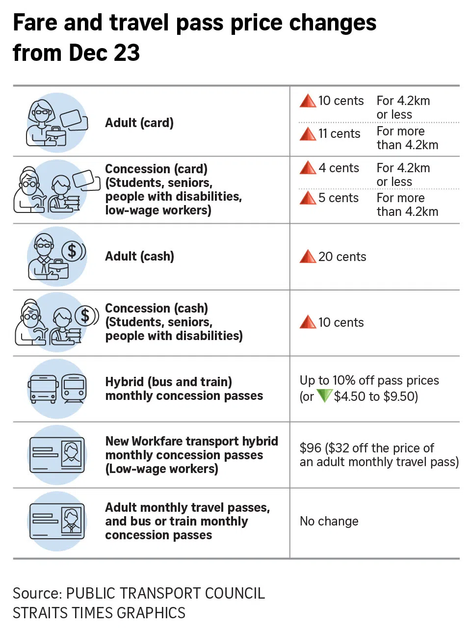 SINGAPORE - Even as adult and concession card fares go up from Dec 23
