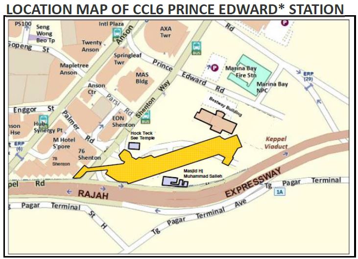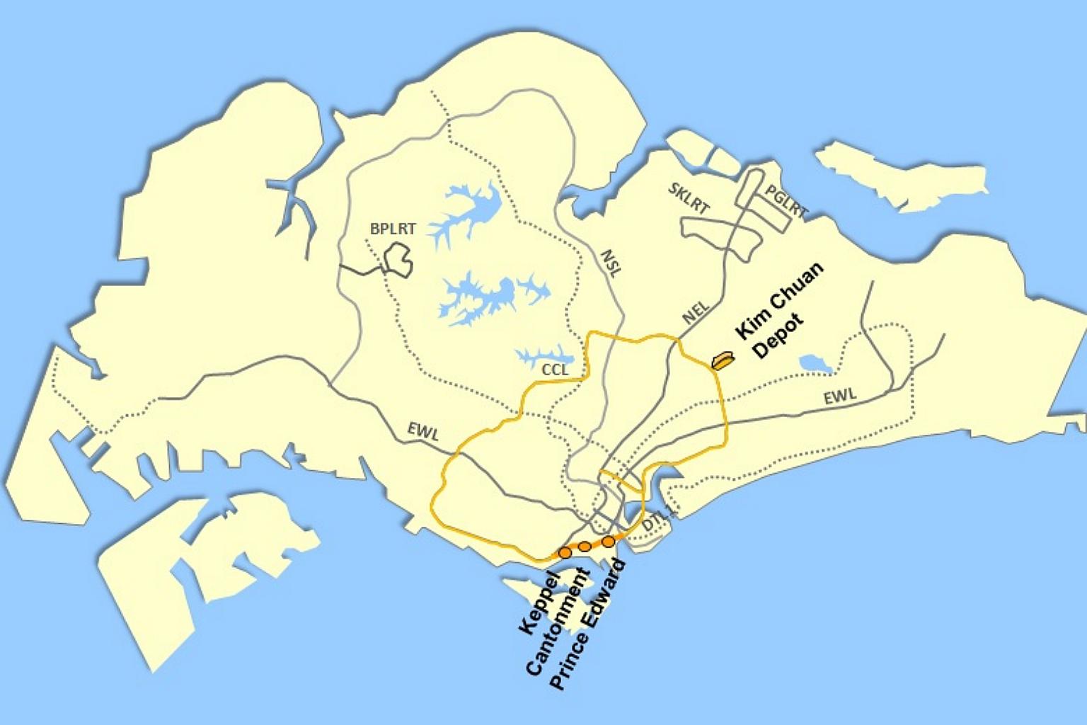 A map showing the locations of the three new Circle Line stations - Keppel, Cantonment and Prince Edward.
