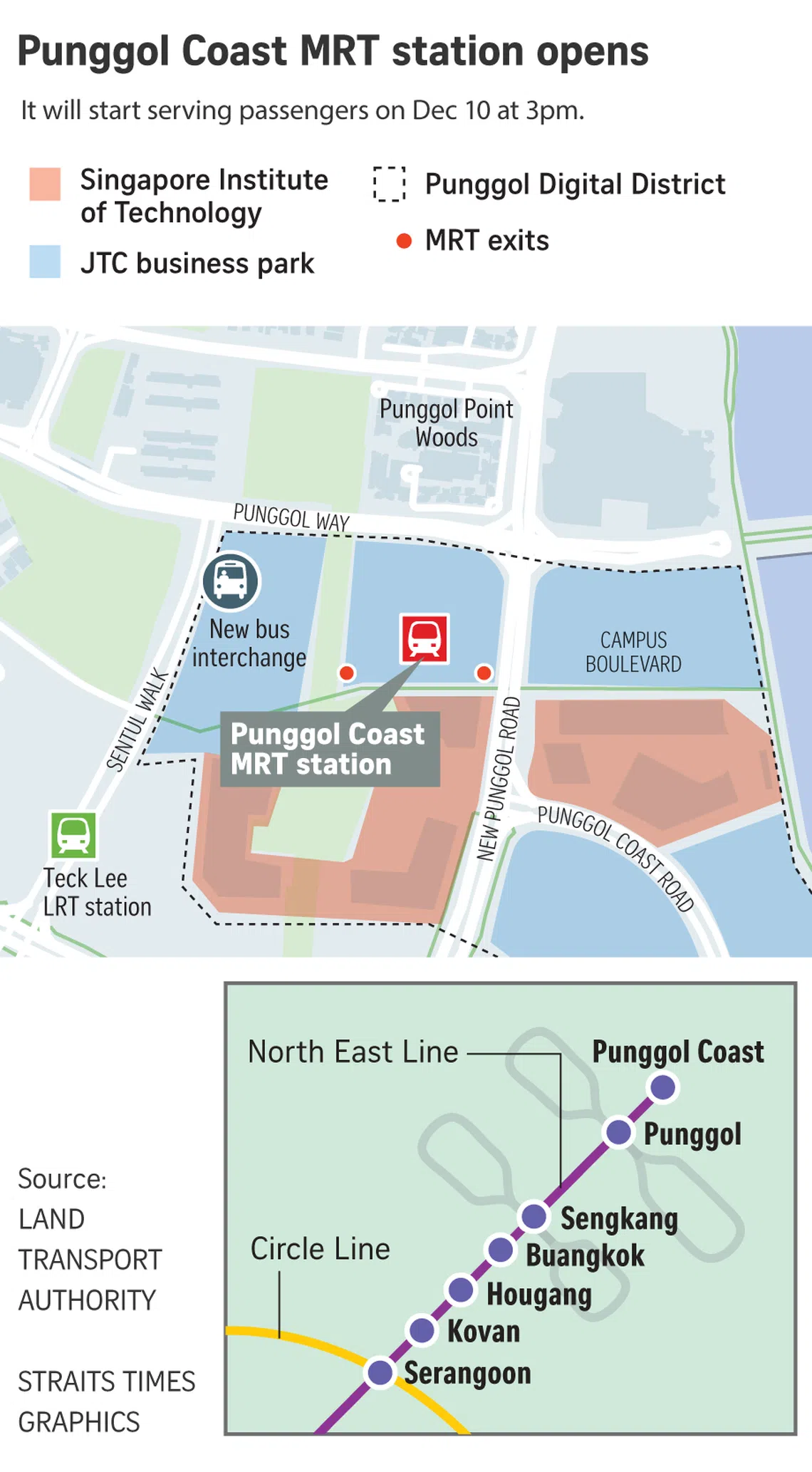 SINGAPORE – Punggol Coast MRT station, an extension from the existing Punggol station on the North East Line, will open for passenger service on Dec 10 at 3pm, the Land Transport Authority (LTA) said on Oct 10.