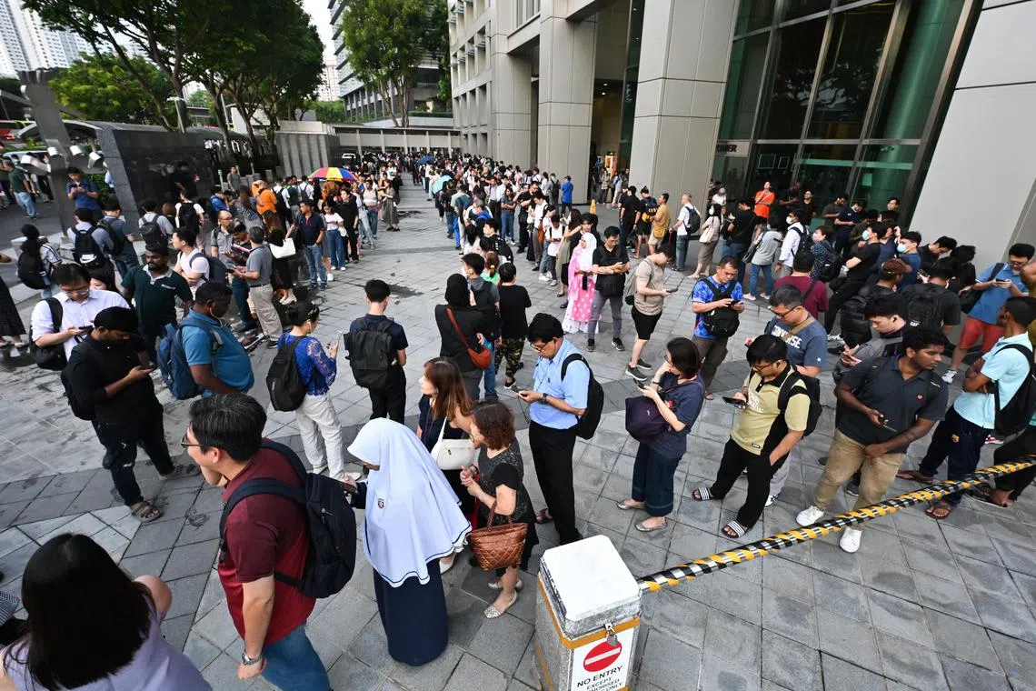 Passengers queueing for bus bridging service outside Ministry of Education building near Buona Vista MRT station at 6.39pm on Sept 25, 2024.