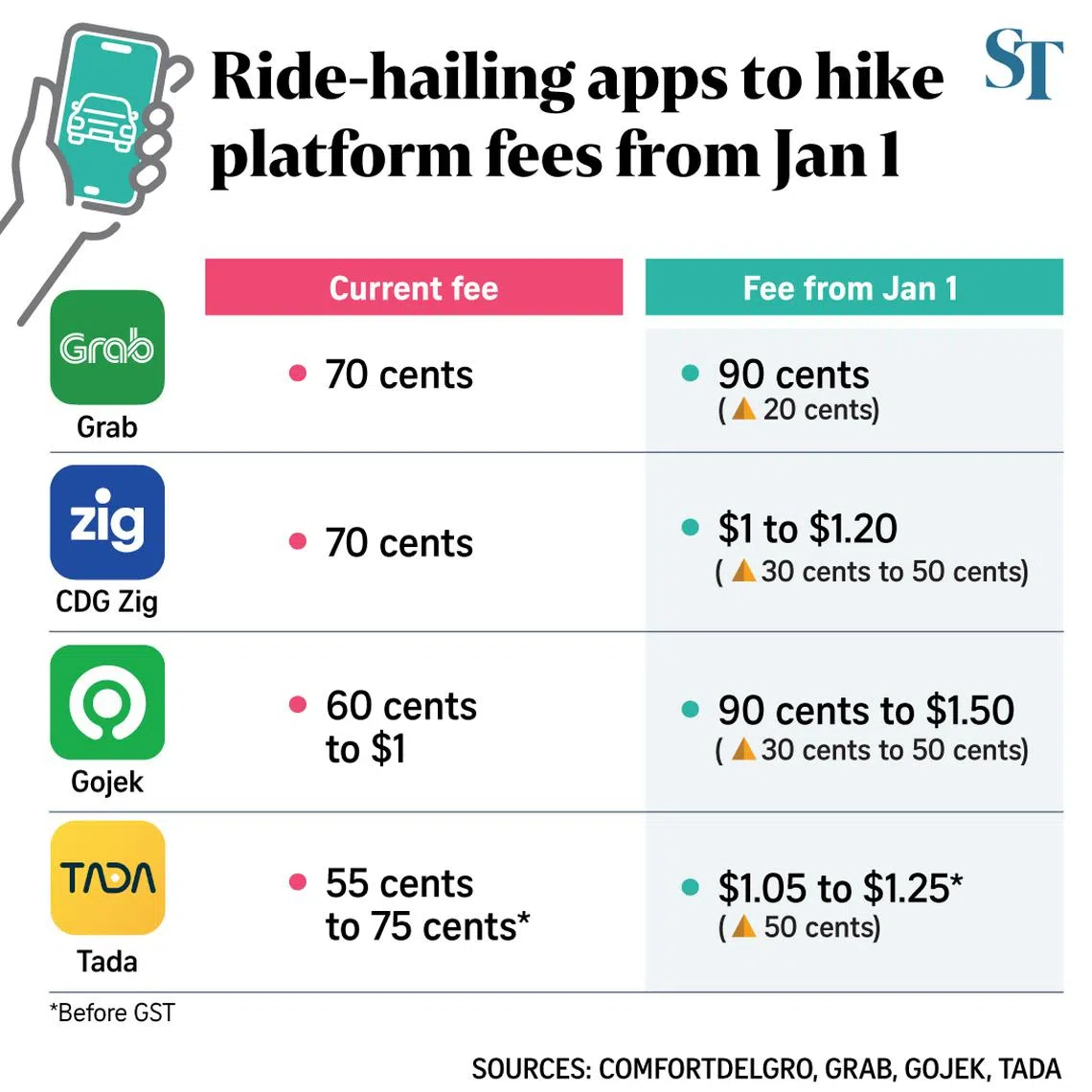 ComfortDelGro, the largest taxi operator in Singapore, will follow suit and raise its platform fee by 30 cents to 50 cents, from a flat rate of 70 cents to a range of $1 to $1.20 based on distance travelled and travel time.