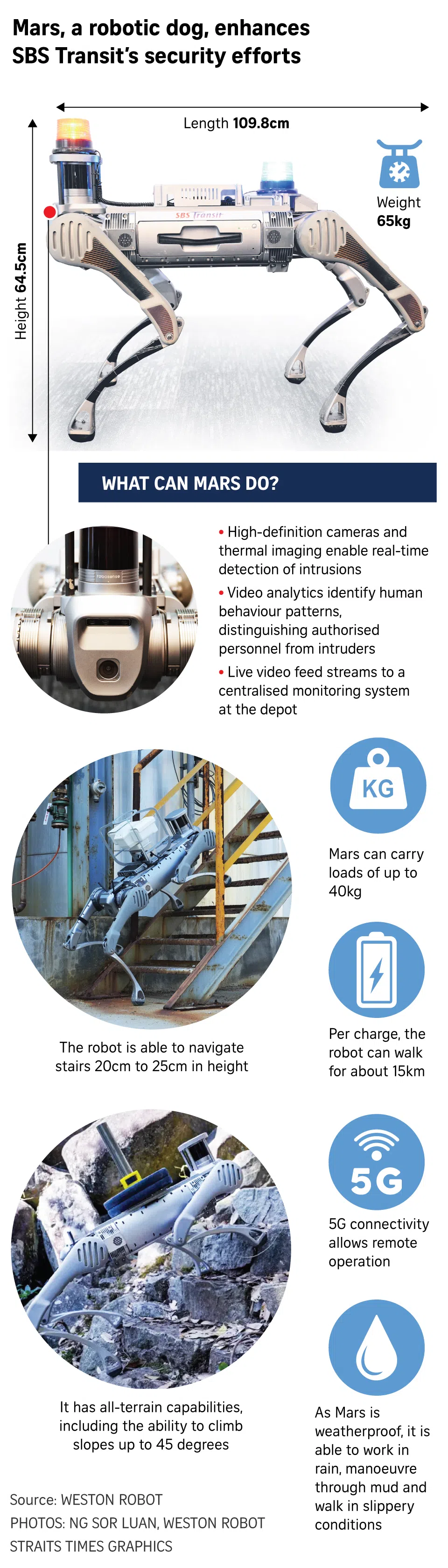 Robots like Mars can augment – though not replace – the efforts of security officers, Mr Sim said. For example, Mars can see better at night than the naked eye, and its thermal cameras can more easily detect animal or human forms from far away.
