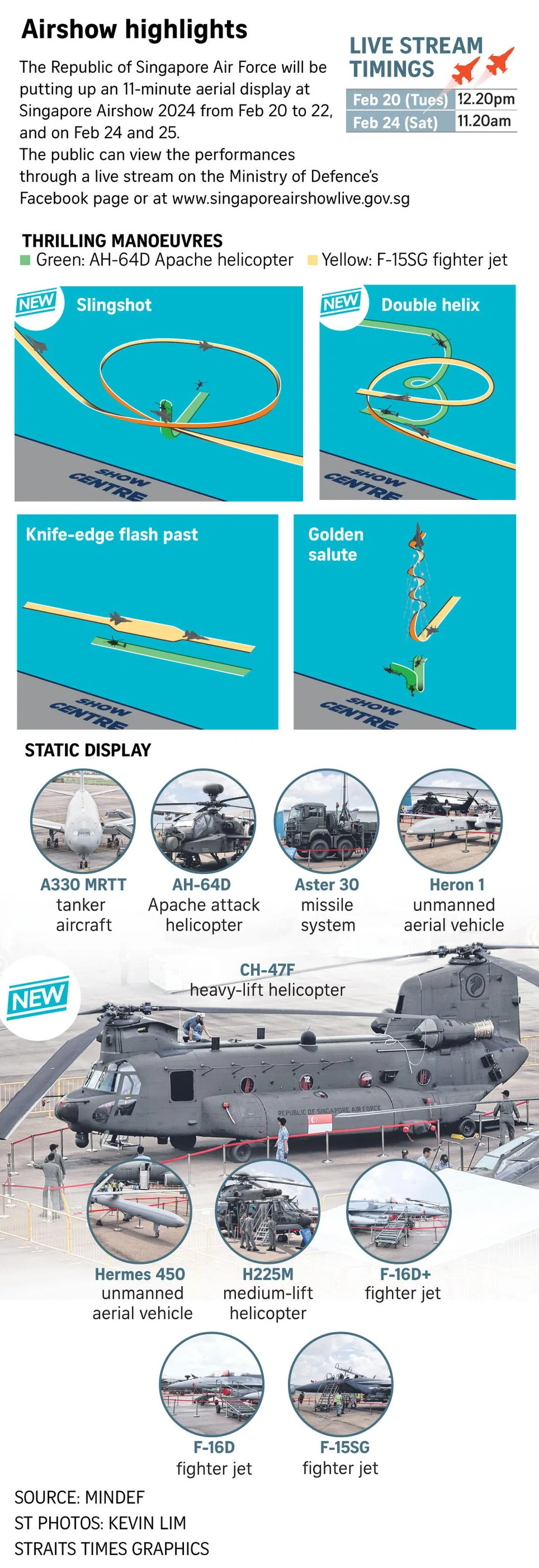 SINGAPORE - The Republic of Singapore Air Force (RSAF) will be deploying an F-15SG fighter jet and an AH-64D Apache helicopter for its aerial display at Singapore Airshow 2024.