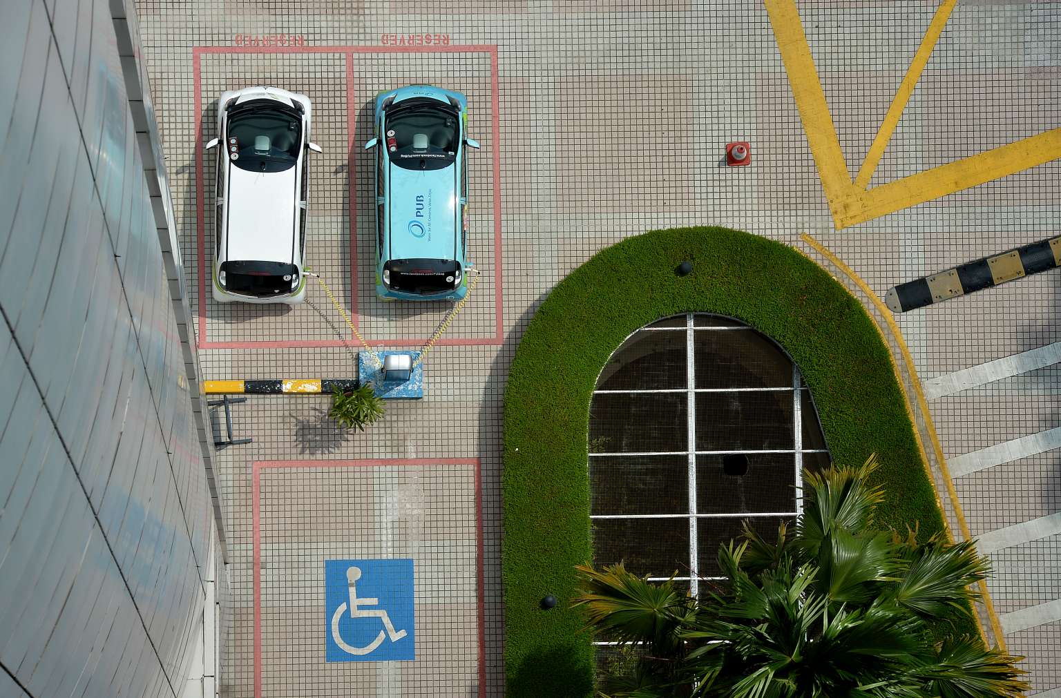 Aerial view of the parking lots, including one for the disabled, at a car park.