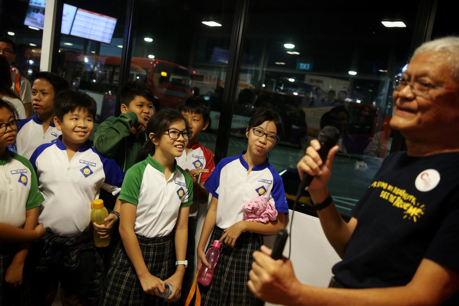 Sengkang Primary School students listen as Mr Lawrence Tan (left), who lost his sight to glaucoma, speaks about his experiences using public transport, at Sengkang Bus Interchange, on May 17, 2019.