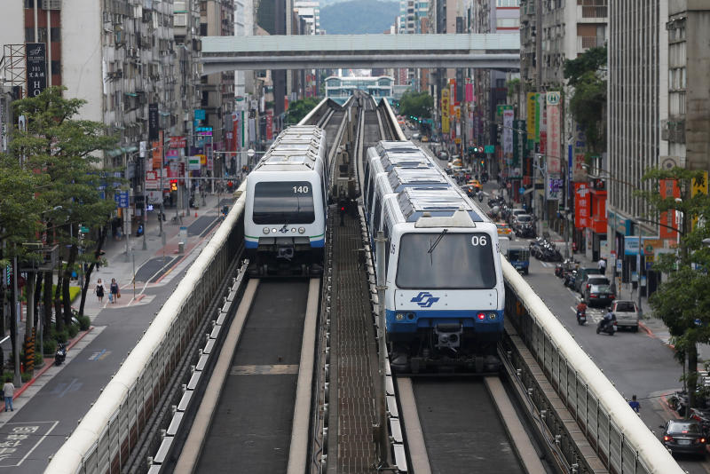 Trains operated by Taipei Rapid Transit pass residential buildings in Taipei on July 6, 2017.
