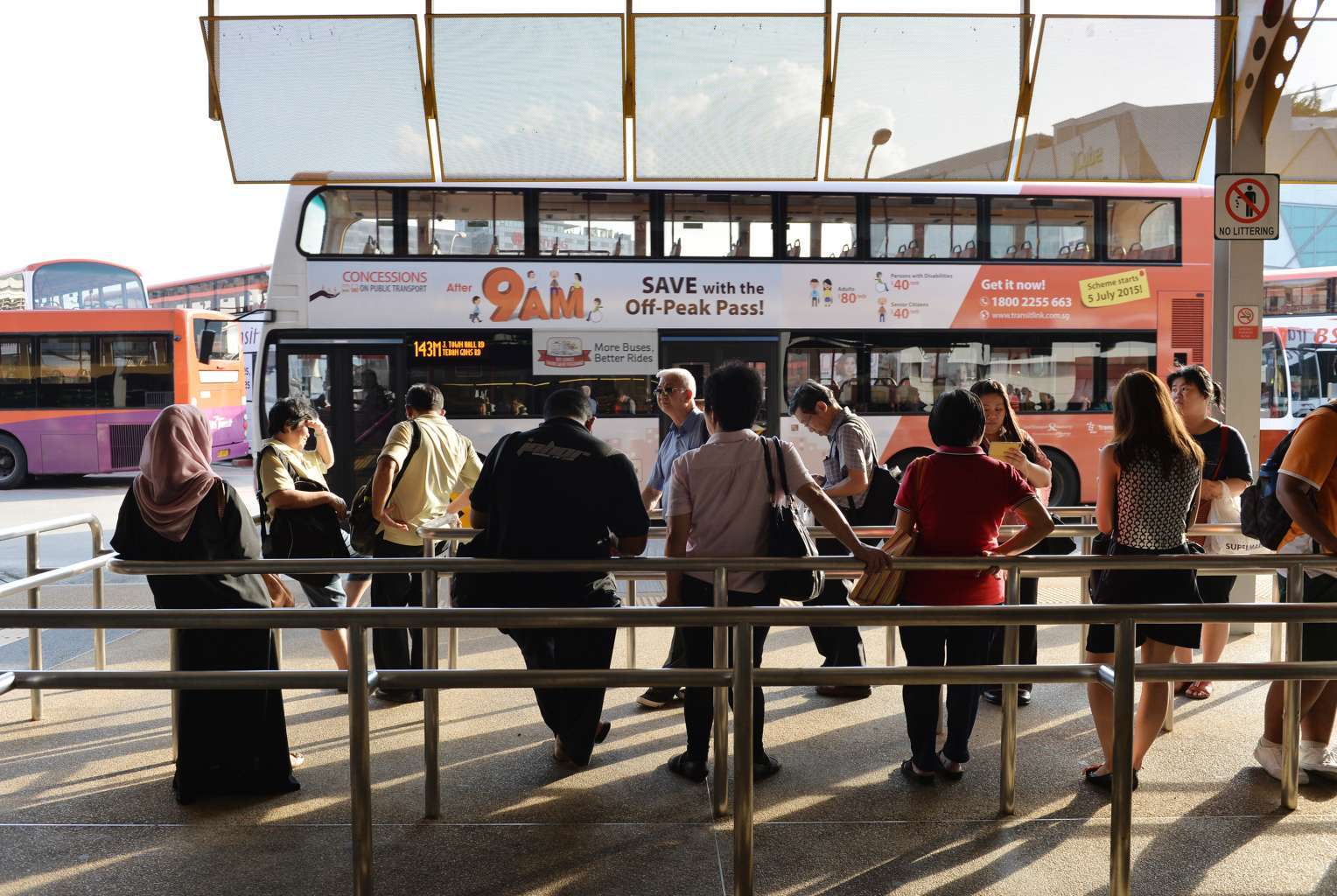Commuters waiting in line for their buses at Jurong East bus interchange.