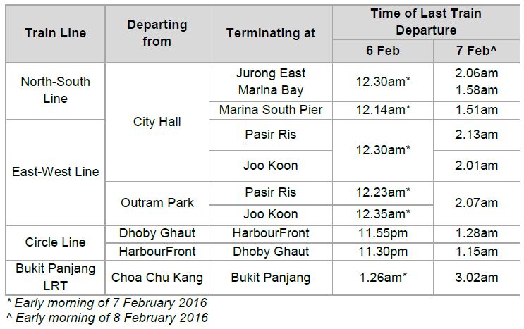 The same will apply to the SMRT-run North-South, East-West and Circle Lines, as well as as the Bukit Panjang LRT system, although SMRT will also extend train operating hours on Saturday (Feb 6).