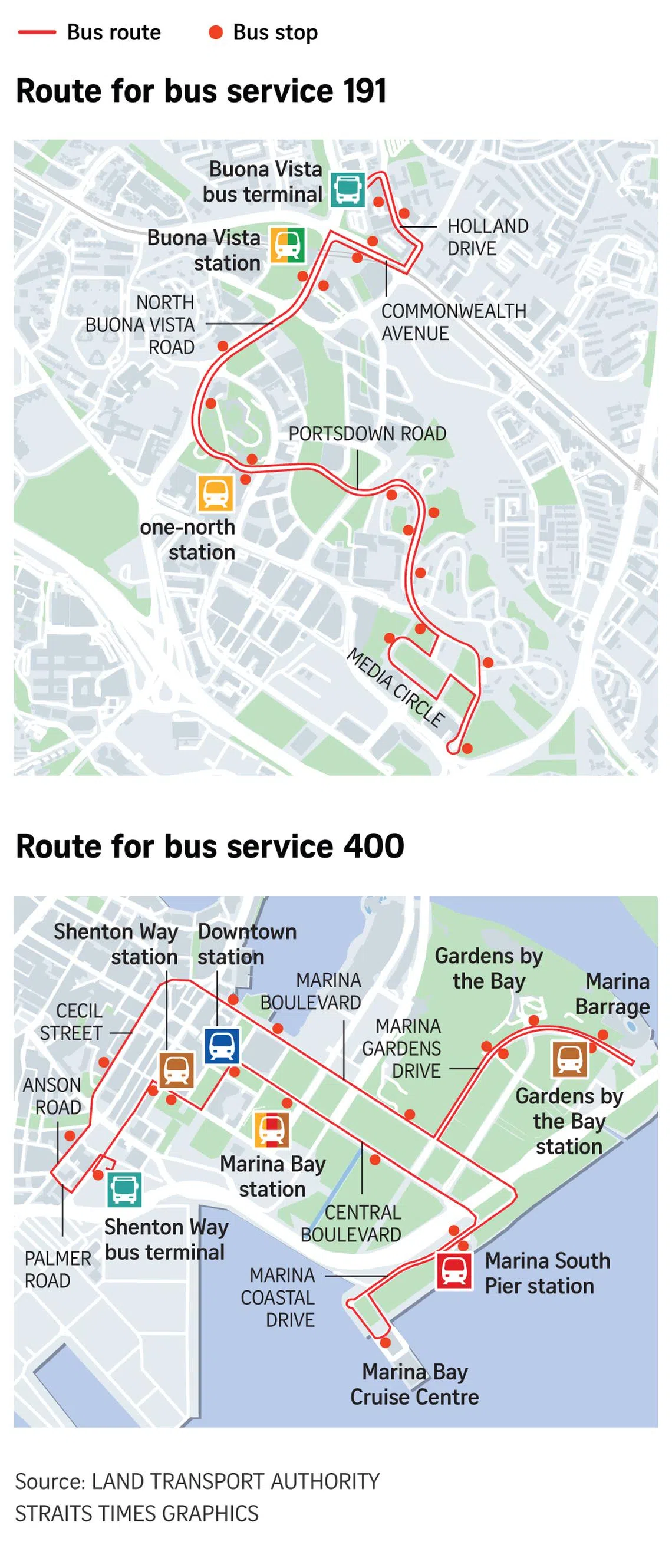 The second route, service 191, serves the one-north area, stopping at one-north and Buona Vista MRT stations, as well as Buona Vista bus terminal.