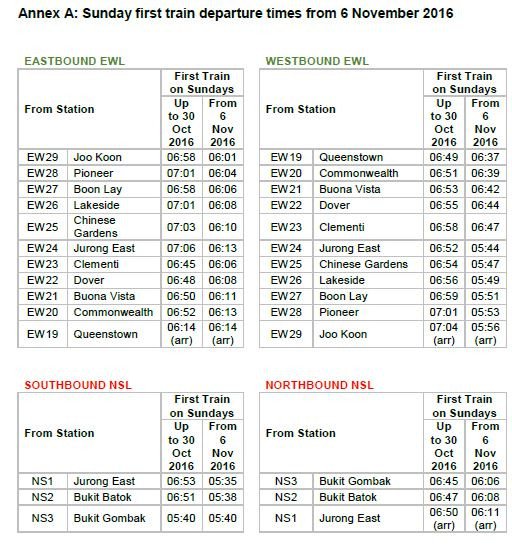 From the first Sunday of November (Nov 6), SMRT train services will resume regular service start times on Sunday mornings from Joo Koon to Queenstown on the East-West Line (EWL), and from Bukit Gombak to Jurong East on the North-South Line (NSL).