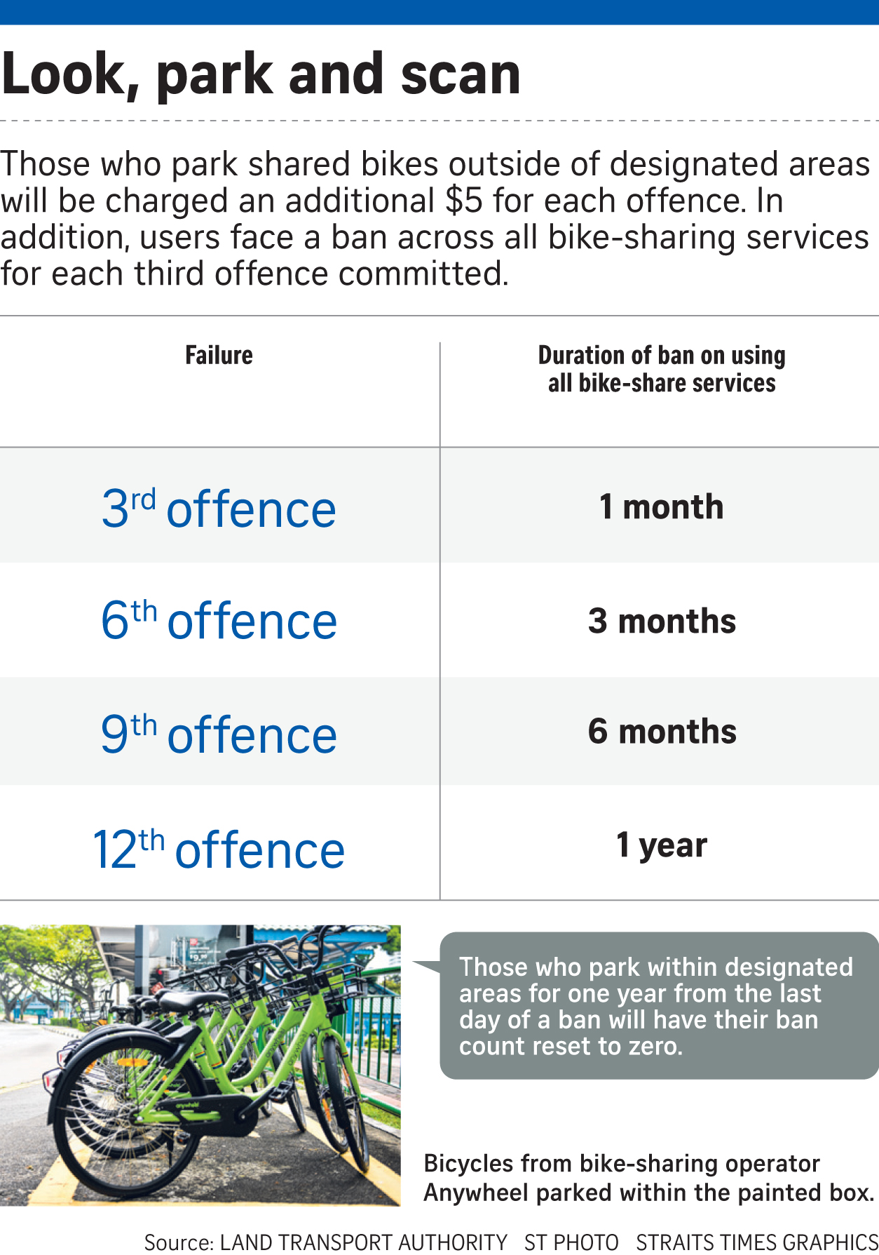 The Land Transport Authority (LTA) said yesterday that users will not only have to lock the bikes, but also scan a quick response (QR) code at these parking areas to end their journeys.