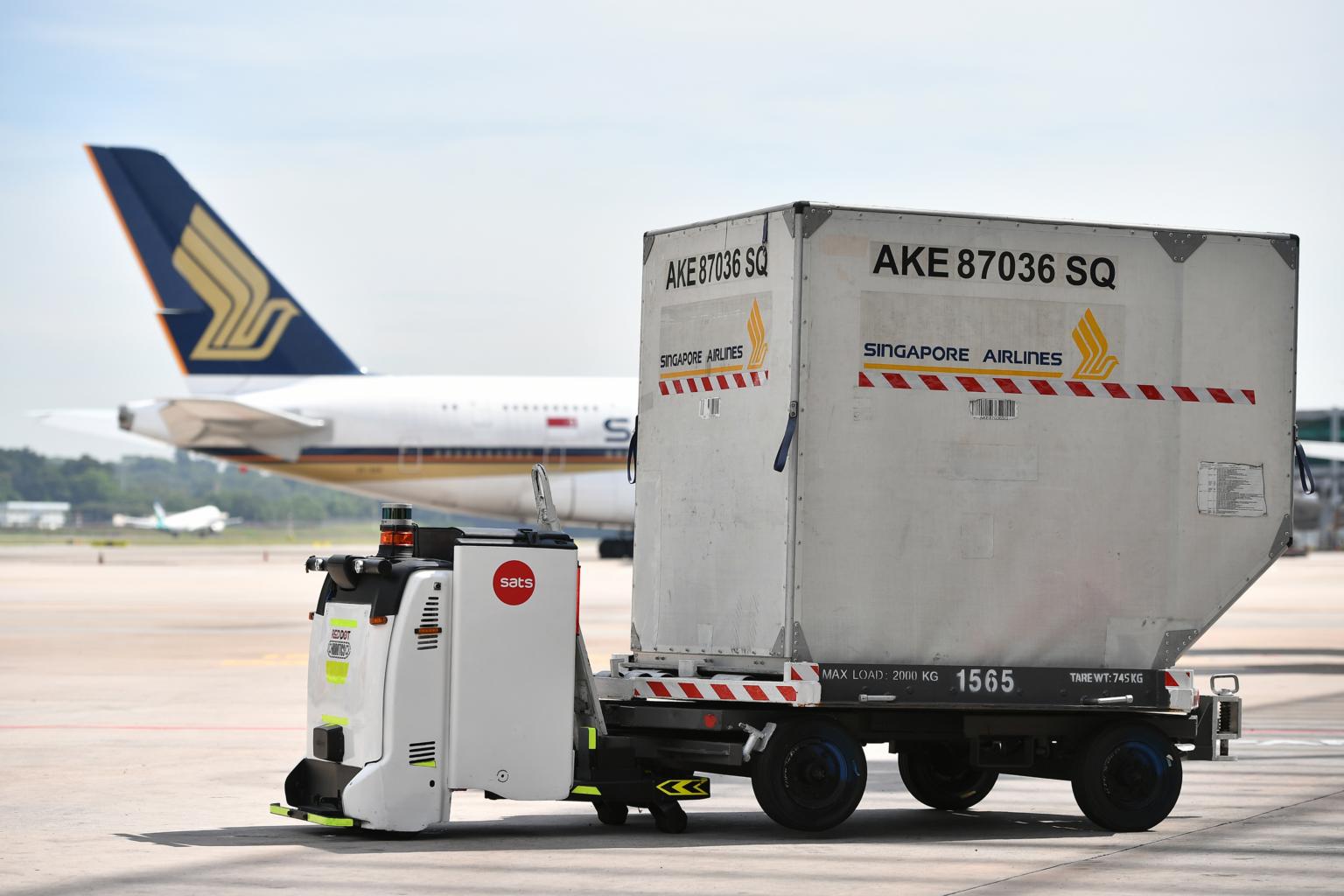 A SATS Technology Autonomous Guided Vehicle with the container trailer at Changi Airport, on May 14, 2018.