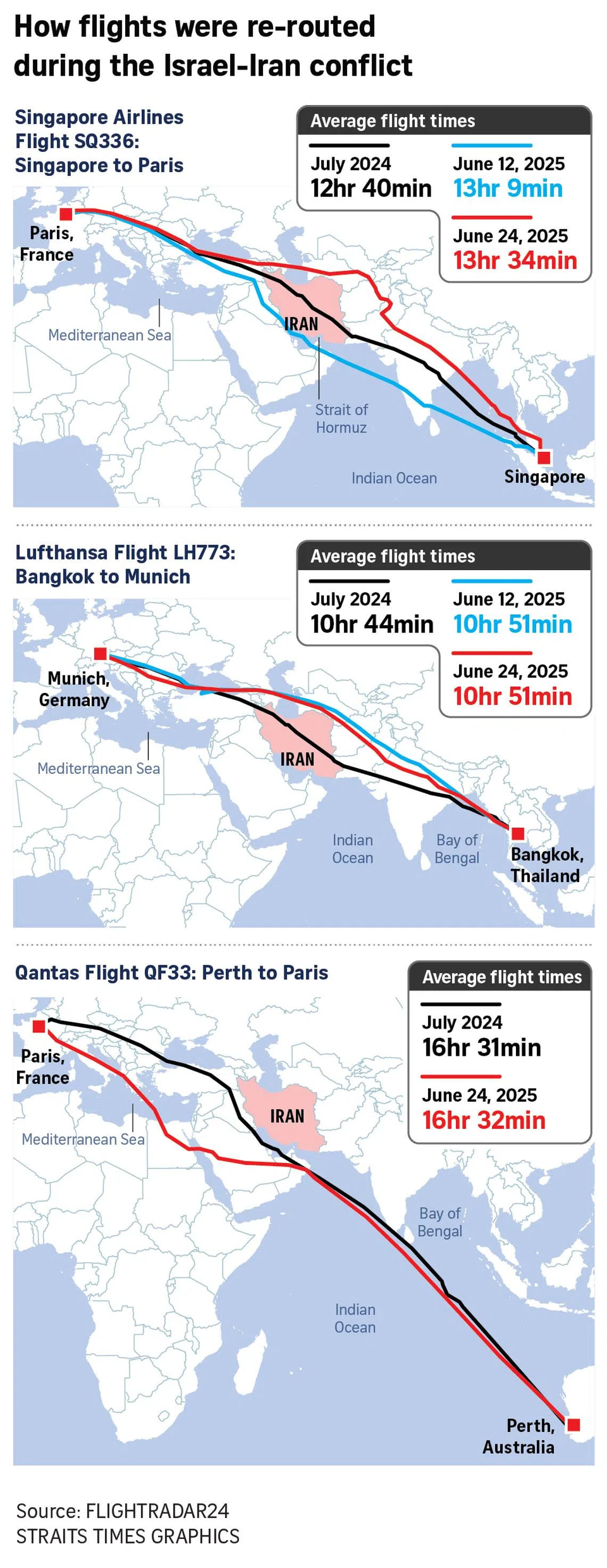 But these flights may take up to an hour longer because of the need to skirt Lebanese, Jordanian, Iraqi, Israeli and Iranian airspace – a key artery for Asia-Europe air traffic before the Iran-Israel conflict erupted.