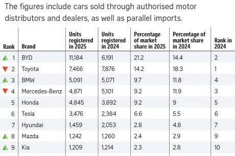 - BYD was Singapore's best-selling car brand, registering 11,184 units in 2025, an 80.6% increase from 2024.