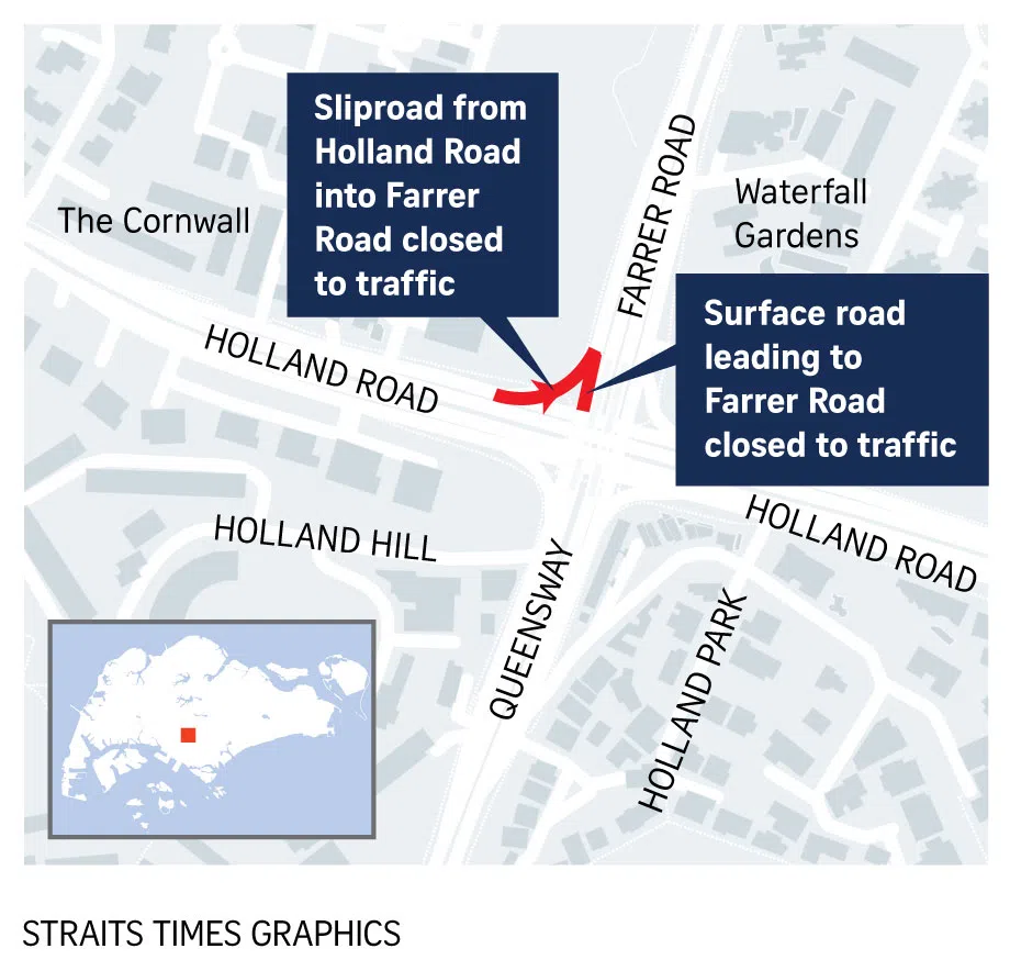 SINGAPORE - A slip road leading from Holland Road and Commonwealth Road into Farrer Road as well as an adjoining road have been closed to traffic since Tuesday as workers repair a cave-in caused by tunnelling works.
