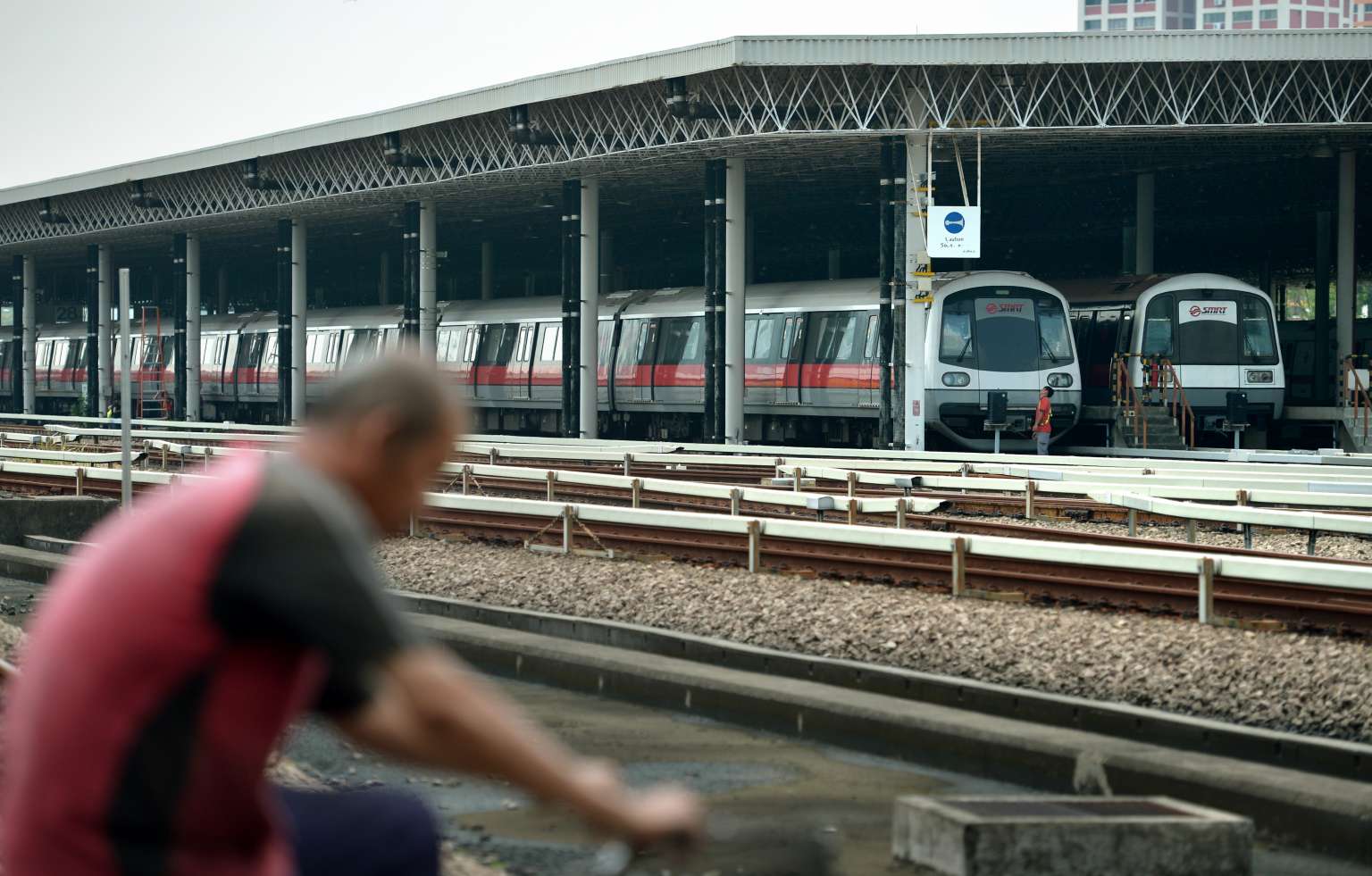 SMRT staff cycles past SMRT trains parked at the Bishan depot on Nov 12, 2015.