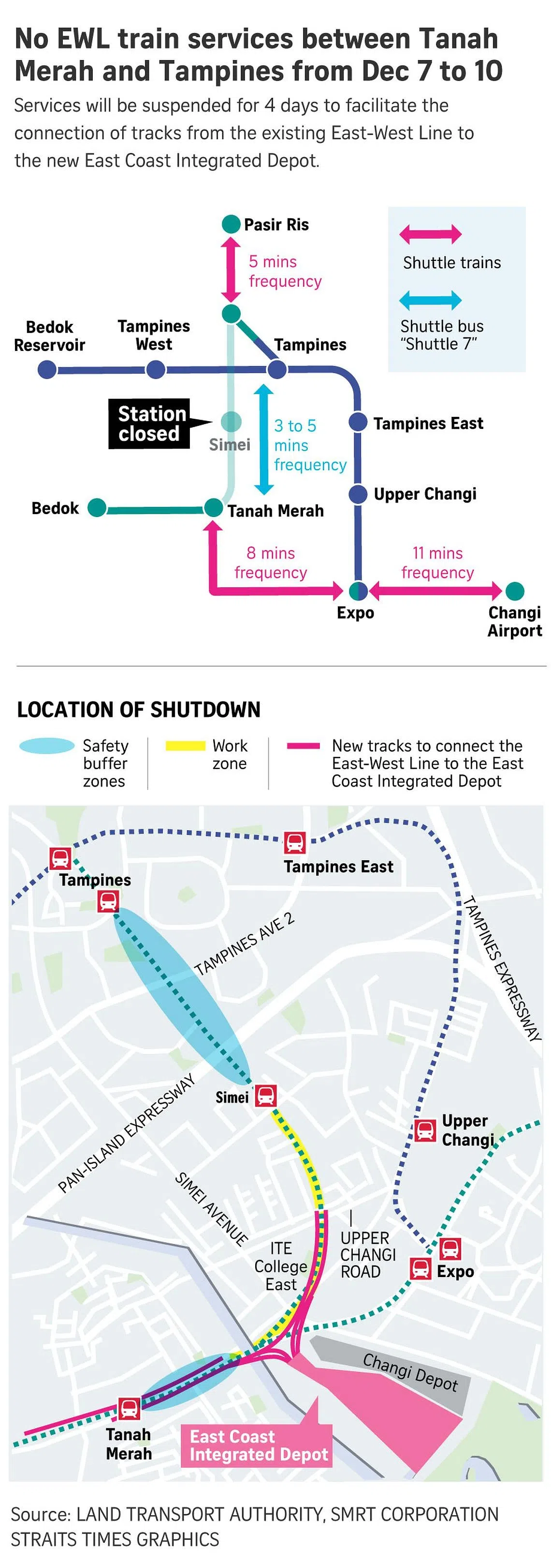 Instead of regular train service, shuttle trains will run every five minutes between Tampines and Pasir Ris stations, every eight minutes between Tanah Merah and Expo stations, and every 11 minutes between Expo and Changi Airport.