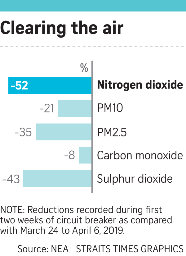 In response to queries from The Straits Times, the National Environment Agency (NEA) said key pollutant levels have been falling even before the circuit breaker measures started. The levels fell further after the measures kicked in on April 7.