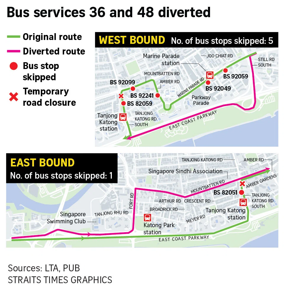 The road closure also means bus services 36 and 48 will be diverted and skip bus stops along Marine Parade, Amber, Mountbatten and Tanjong Katong roads, LTA said in a Facebook post on July 27.