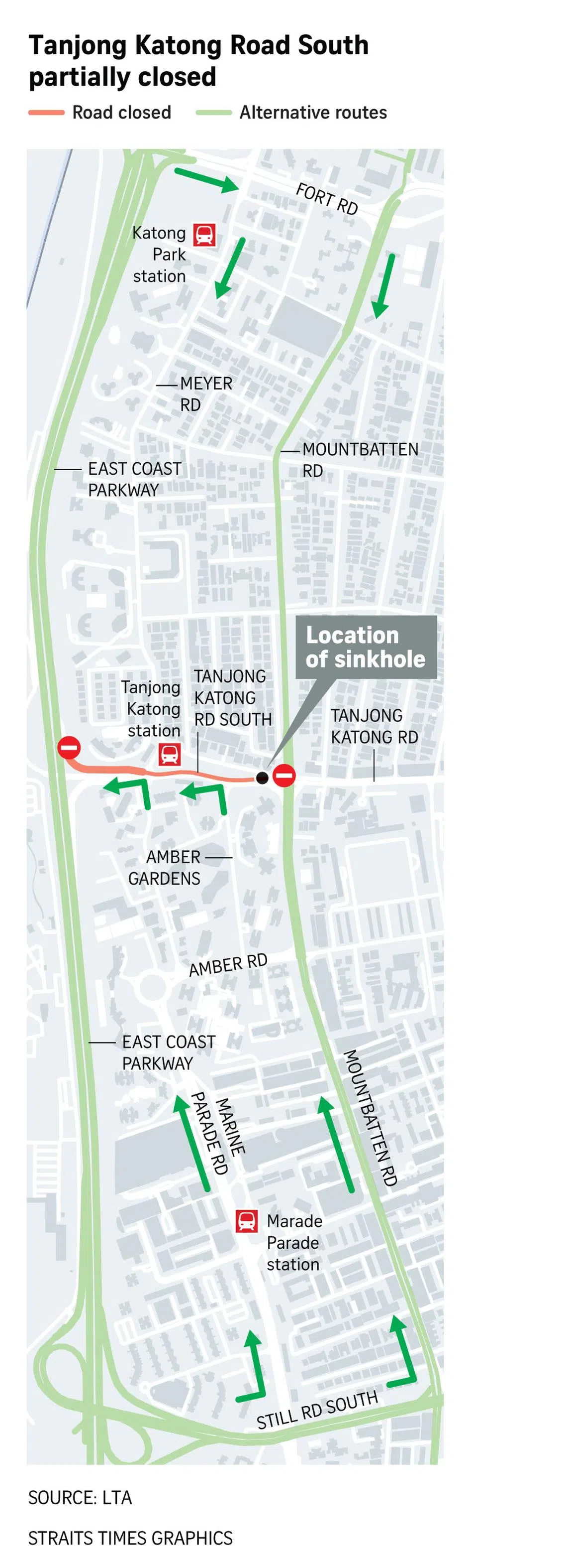 That stretch of Tanjong Katong Road South between Mountbatten Road and East Coast Parkway remains closed until further notice, said the Land Transport Authority (LTA), one day after the sinkhole caused two lanes of the road to collapse.