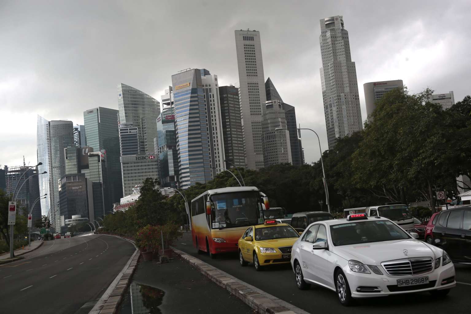 Traffic waiting at a junction, pictured against the financial district, in Singapore, Jan 22, 2016.