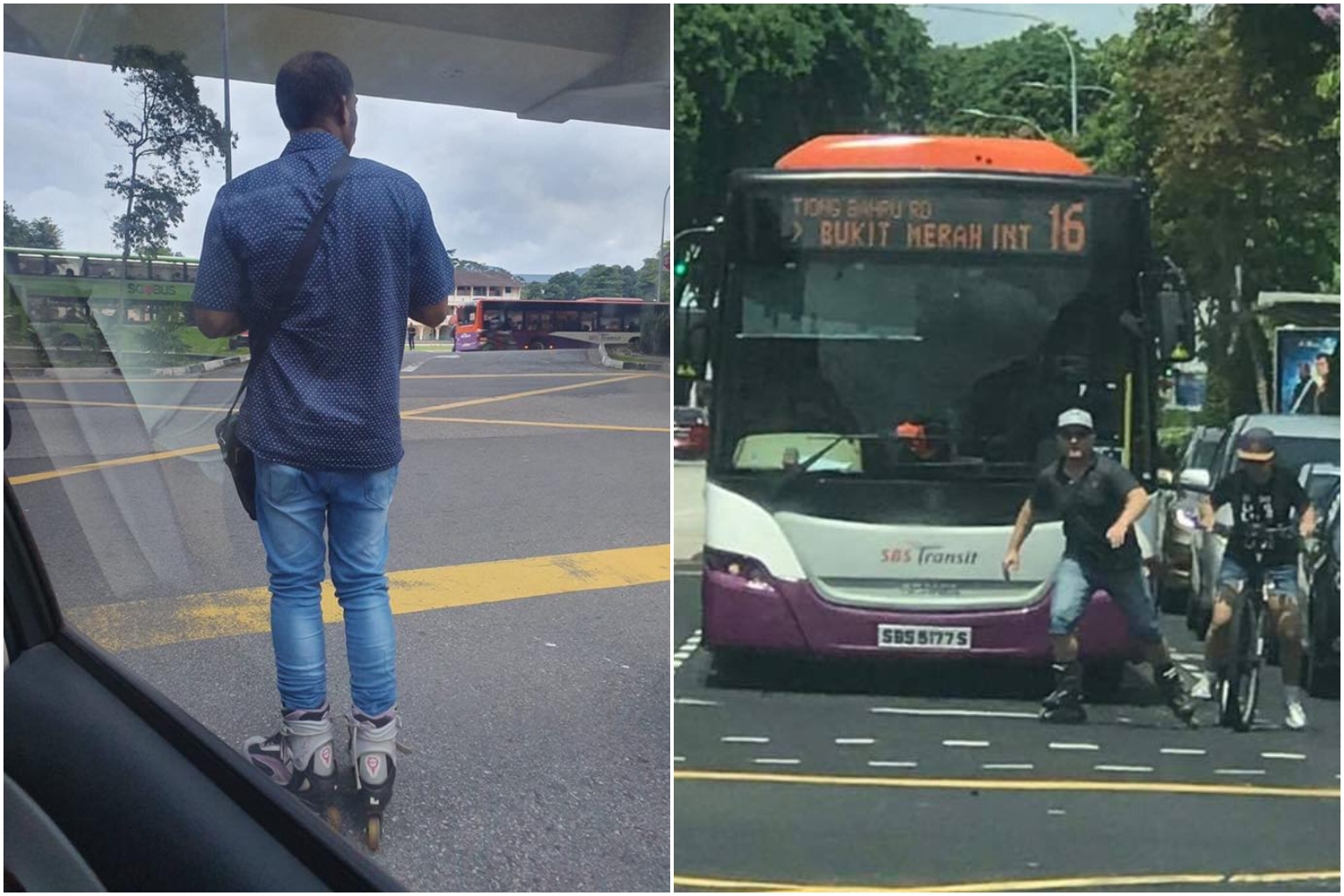 Early on Tuesday afternoon (June 18), a man wearing in-line skates was spotted on the road waiting for the traffic lights to turn green in front of SBS Transit bus service 16.