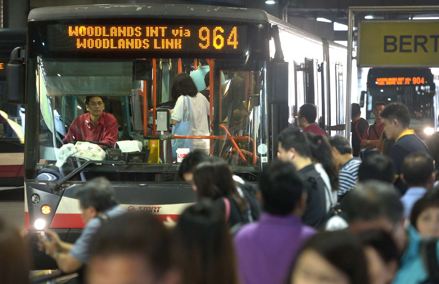 Early morning commuters at Woodlands bus interchange boarding buses.