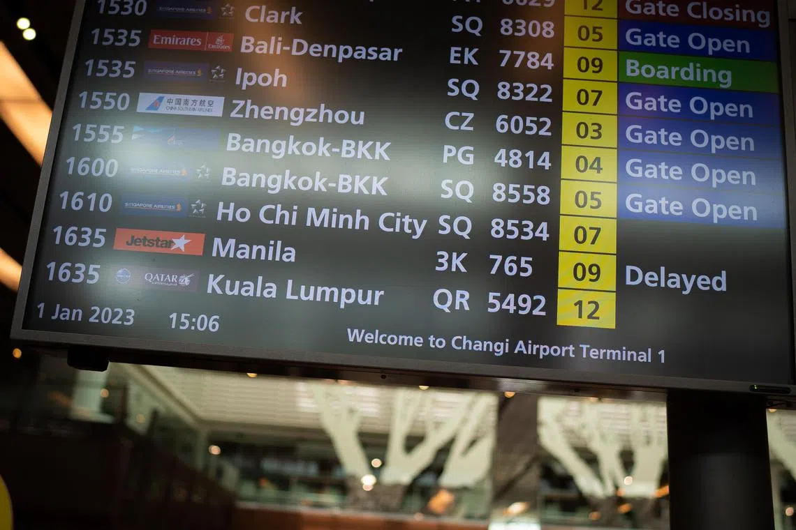 The flight display board at Changi Airport Terminal 1 showing a delay for a flight to Manila, on Jan 1, 2023.