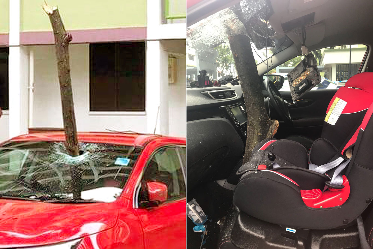 A 2m-long tree branch pierced through the windscreen of a car that was parked at an open-air carpark near Block 6, Jalan Bukit Ho Swee, on Sunday afternoon. No one was injured as the red-coloured vehicle was vacant at the time. The branch reportedly fell from a nearby tree measuring some 11m in height. The car's bonnet was damaged, as were the lights inside the vehicle and a dashboard camera. The car owner, a 39-year-old man, was reportedly visiting relatives along with his family.