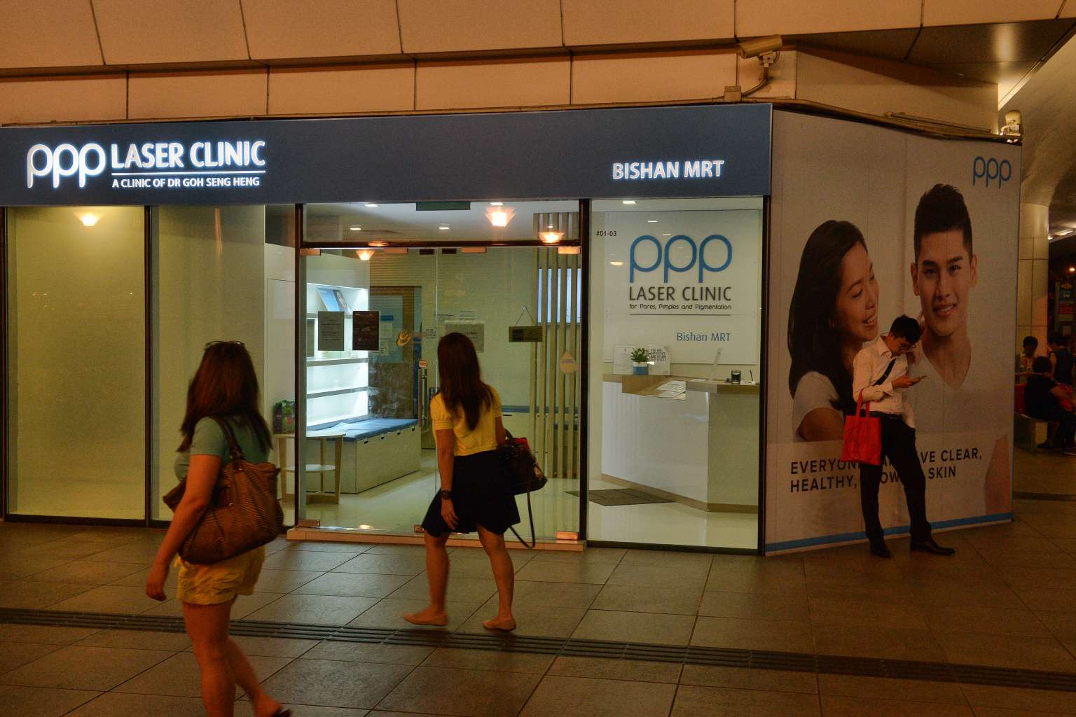 People walking past the Bishan branch of the PPP Laser Clinic.