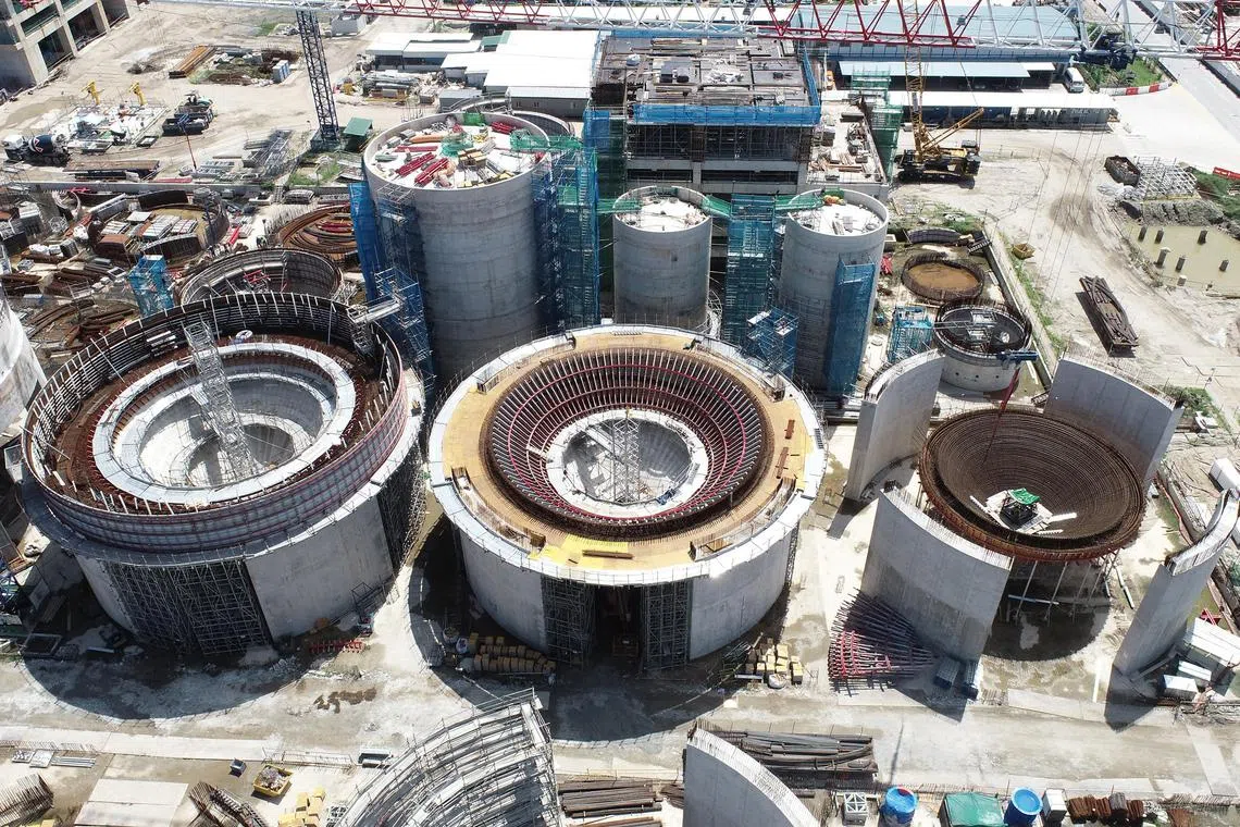 The 40m-tall sludge digesters under construction at the Tuas Water Reclamation Plant, on Sep 21.