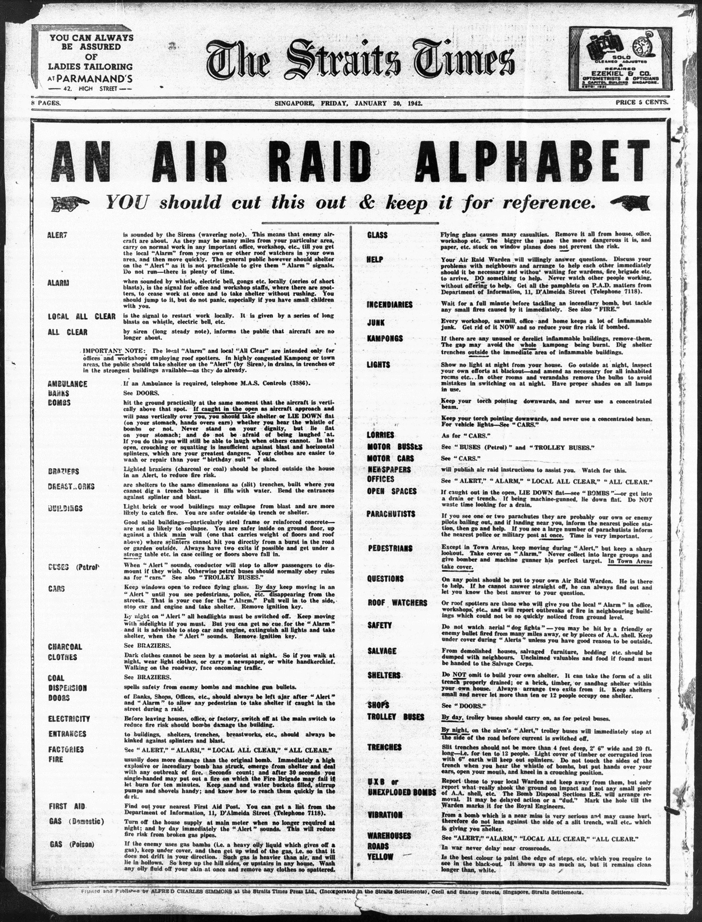 The instructions appeared on the back page of The Straits Times, under the headline "An air raid alphabet". Cut and keep for reference, readers were told.