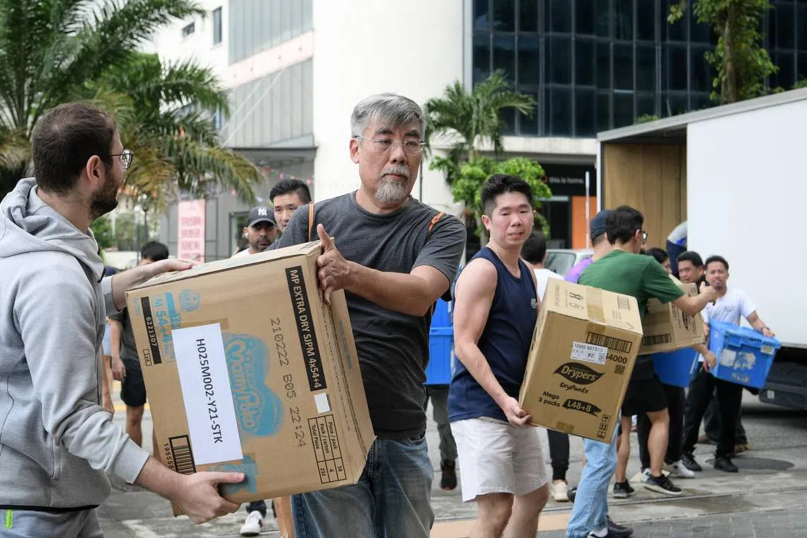 Volunteers unloading donations of diapers that just arrived to the collection point at 10 Genting Lane on Friday.