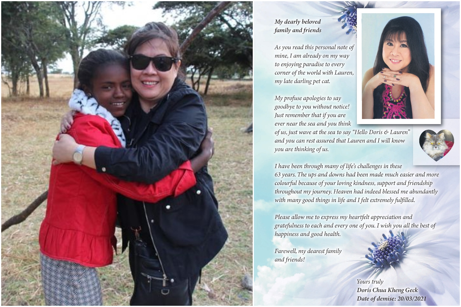 Ms Doris Chua in Ethiopia in 2017 with Konjit, the Ethiopian girl she started sponsoring in 2016 (left) and the obituary Ms Chua herself prepared and paid for months before her death on March 20.