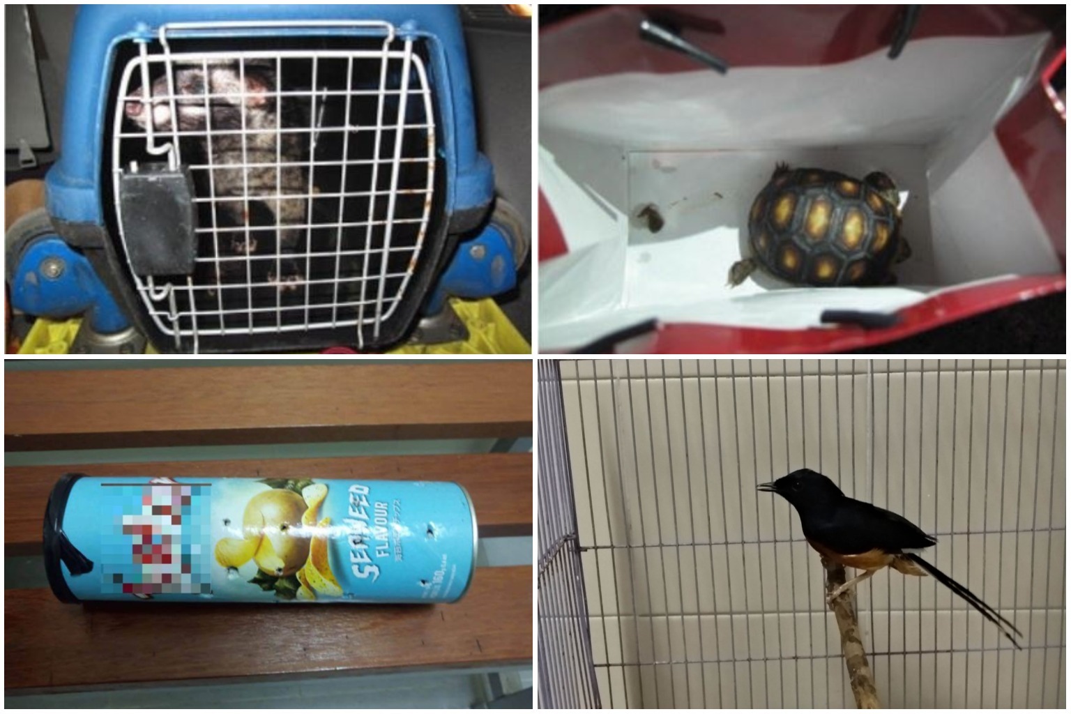 Desiree Lim was fined $3,600 for possessing illegal wildlife, including a civet cat (top left) and a red-foot tortoise (top right), while in a separate case Lim Ke Yi was caught hiding a white-rumped shama in a potato chip tube.