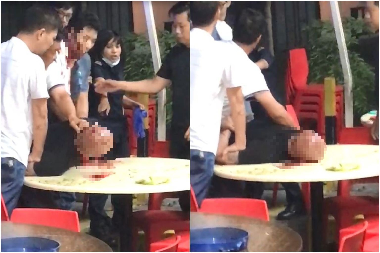 A video of the incident, which was sent to citizen journalism site Stomp, shows three men pinning down the 51-year-old, who is bald, on a table in the coffee shop.