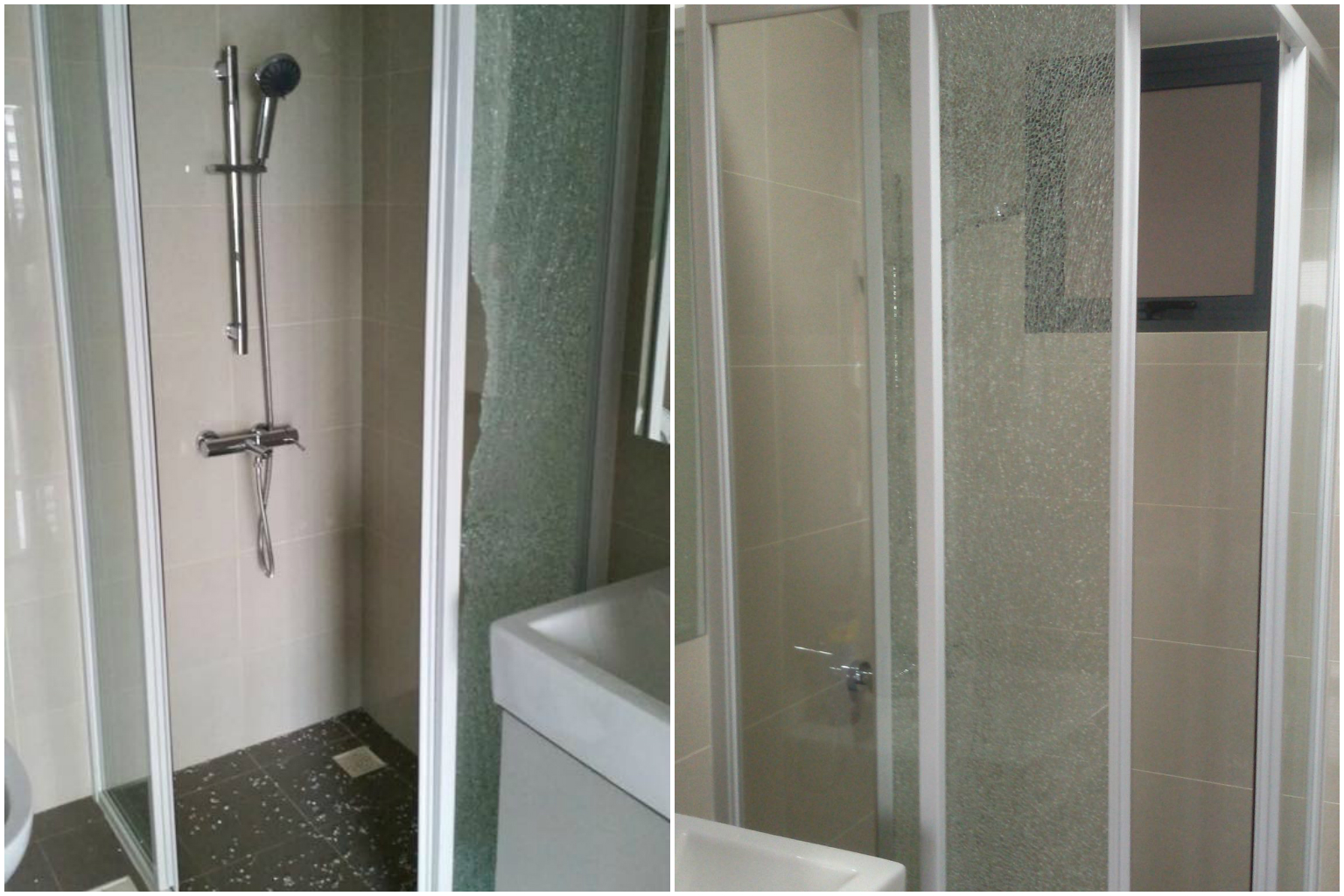 Madam Jaime Chen's glass shower panel (left) shattered even though her family has not moved in yet. Mr Christopher Tan said that his shattered (right) despite having a safety film.